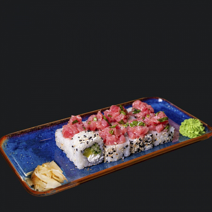 Состав: Нори, Рис, Тунец, Сыр творожный, Огурец, Дайкон, Базилик, Масло оливковое, Соус рыбный, Кунж...