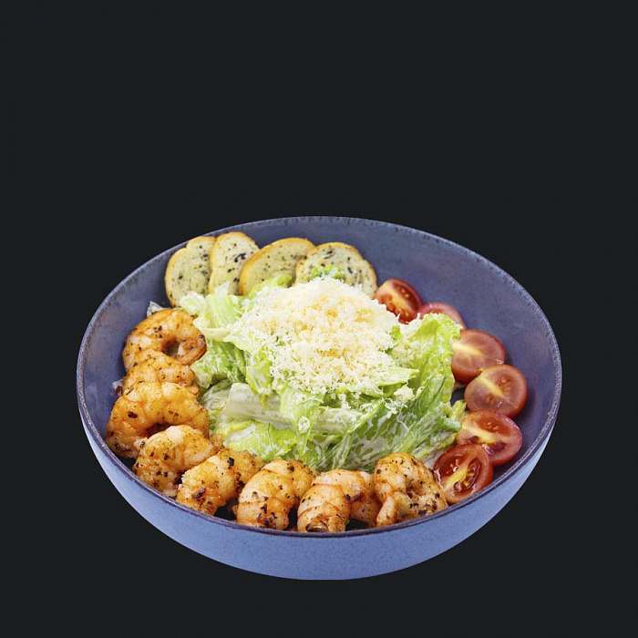 Состав: Айсберг, Креветки, Томат черри, Крутоны, Сыр пармезан, Соус цезарь классический.