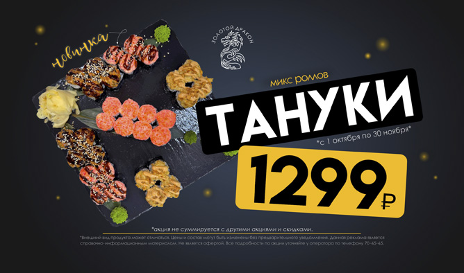 Состав: Ролл "Танто", Ролл "Везувий", Ролл "Дайто", Ролл "Син-гунто". *Присутствуют блюда с чесноком...