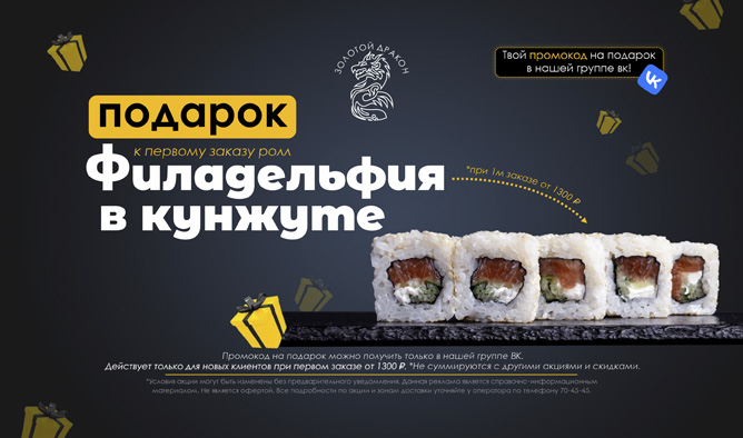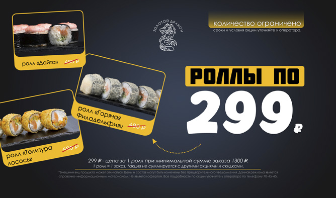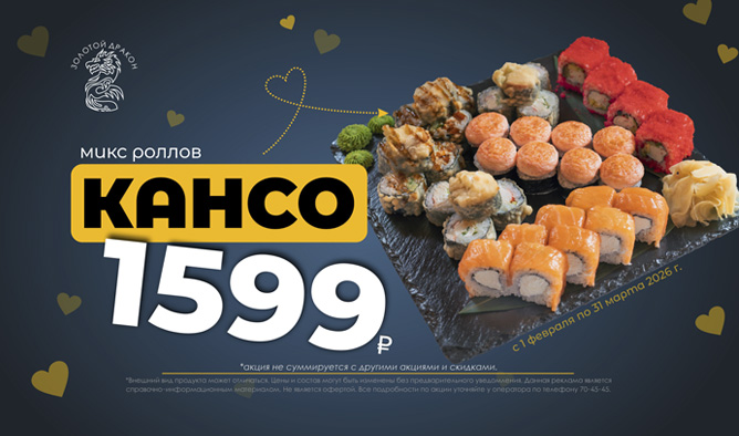 Состав: Ролл "Кани-Тидзу", Ролл "Везувий", Ролл "Горячая Филадельфия", Ролл "Син-гунто". *Присутств...