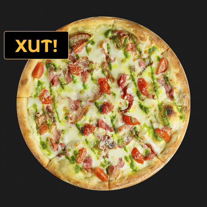 Состав: Тесто, Соус белый, Сыр моцарелла, Бекон, Томат черри, Сыр пармезан, Соус песто.