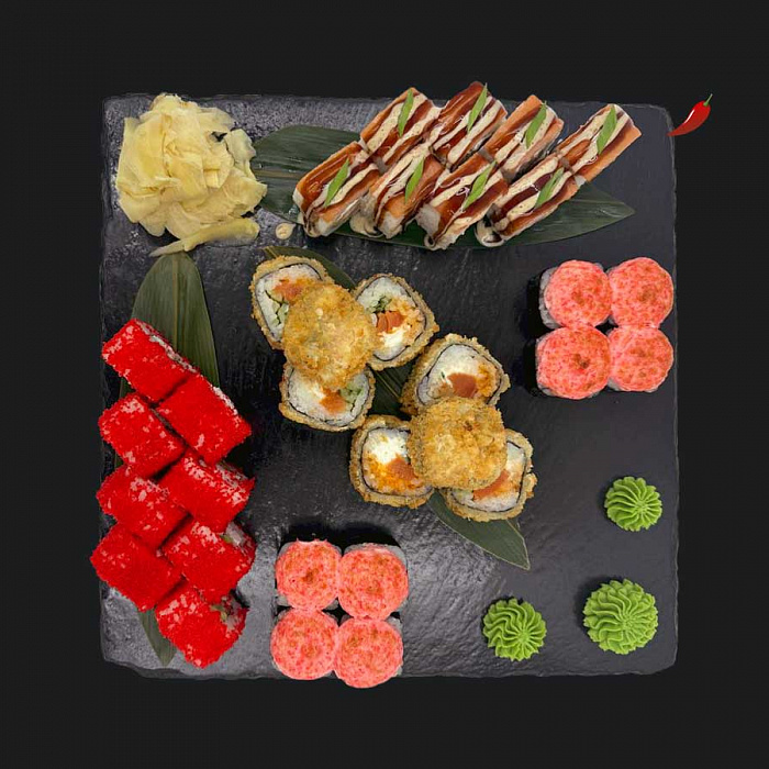 Состав: Ролл "Филадельфия Лайт с соусом спайс", Ролл "Фудзи", Ролл "Окаяма", Ролл "Син-гунто", Ролл ...